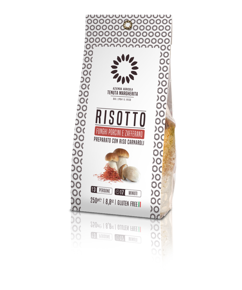 Koostisosad: carnaroli riis 91%, glutamaadivaba puravikupuljong (sool, kartulijahu, pärmiekstrakt, kartuli maltodekstriin, kuivatatud puravik 7%, dehüdreeritud köögiviljad (sibul, porgand ja küüslauk), päevalilleõli, maitseained, pipar), kuivatatud puravik 2% (Boletus Edulis ja teised sama liigi seened), sibul, küüslauk, safran 0,1%, kurkum.