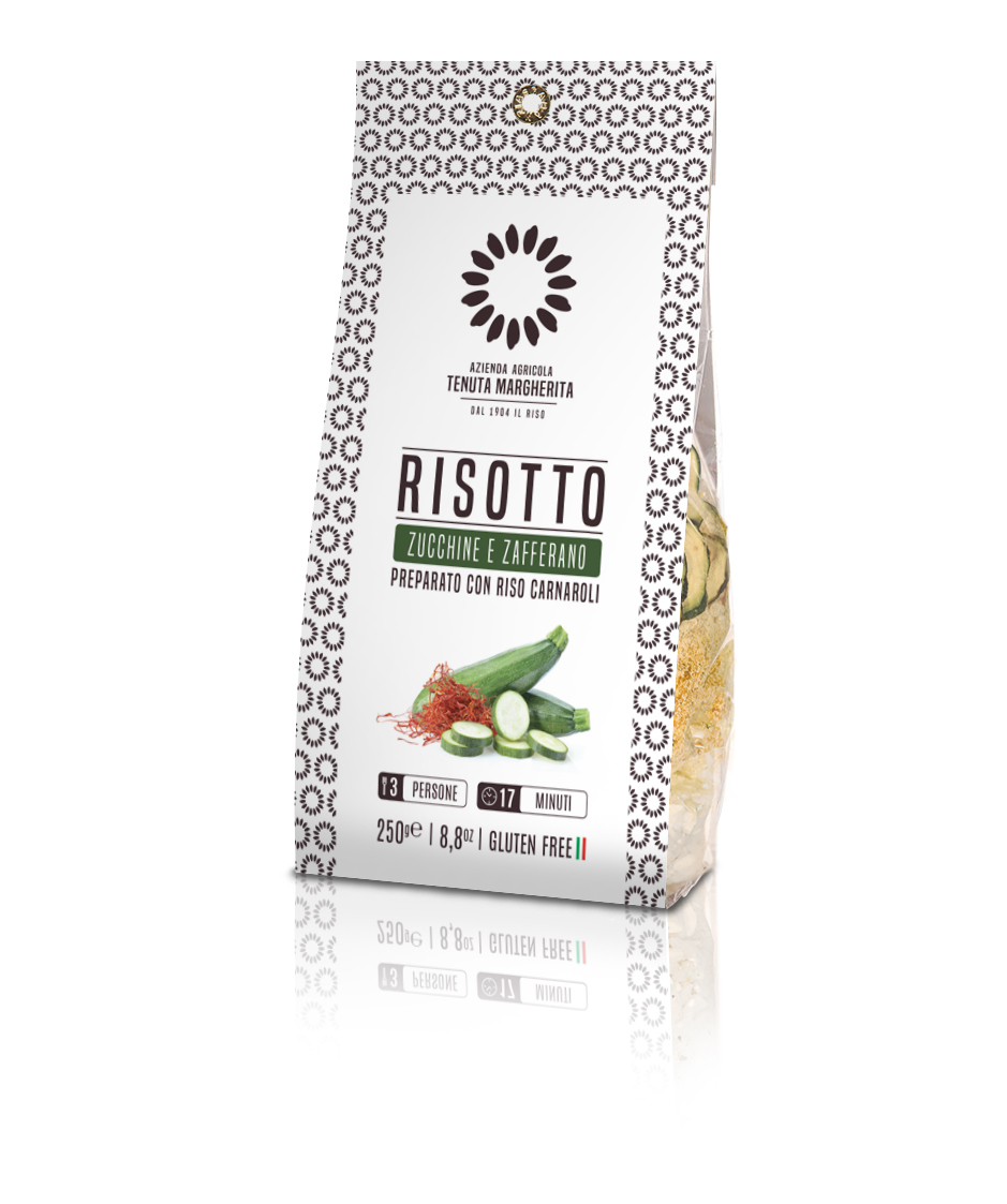 Koostisosad: carnaroli riis 92%, glutamaadivaba köögivilja maitseaine (sool, kartulijahu, pärmiekstrakt, kartuli maltodekstriin, dehüdreeritud köögiviljad (sibul, porgand, seller ja petersell), päevalilleõli, vürtsid ja looduslikud maitseained), suvikõrvits 2%, sibul, petersell, seller, küüslauk, safran 0,1%, kurkum.